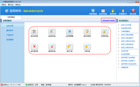 設置啟用的功能模塊保存后,可以看到業務處理界面顯示的功能圖標已經隱藏了退貨模塊和訂單模塊,如圖3所示。