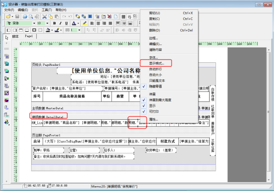 設(shè)置打印模板和單據(jù)界面一致,在開好的單據(jù)界面選擇“打印”—》“打印格式設(shè)計”—》“設(shè)計格式”,進(jìn)入打印設(shè)計器界面,選擇細(xì)項數(shù)據(jù)的單價文本框,右鍵選擇“顯示格式”,如下圖所示: