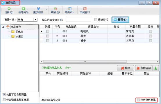 設置完成之后,新開一個單據,添加商品明細進行選擇商品時,“選擇商品”窗口默認不顯示已停用的商品,如圖2所示。