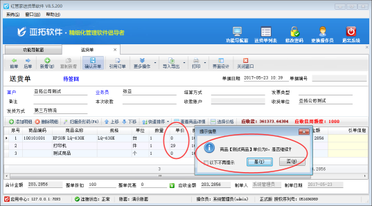 亞拓軟件開發(fā)的亞拓管理軟件、紅管家倉庫管理軟件、紅管家送貨單軟件等在開單據(jù)時如果商品單價為0,系統(tǒng)會彈出提示信息,是否需要繼續(xù)保存,如下圖一所示,這樣以免用戶在添加商品明細(xì)時忘了填寫單價,好及時錄入,但是有一部分用戶在開單據(jù)時只需要填寫商品數(shù)量,不需要填寫單價,那么該怎么設(shè)置系統(tǒng)才能不彈出以下提示信息呢?本篇文章以紅管家送貨單軟件為例介紹一下如何設(shè)置送貨單開單時商品單價為0系統(tǒng)不彈出提示信息?