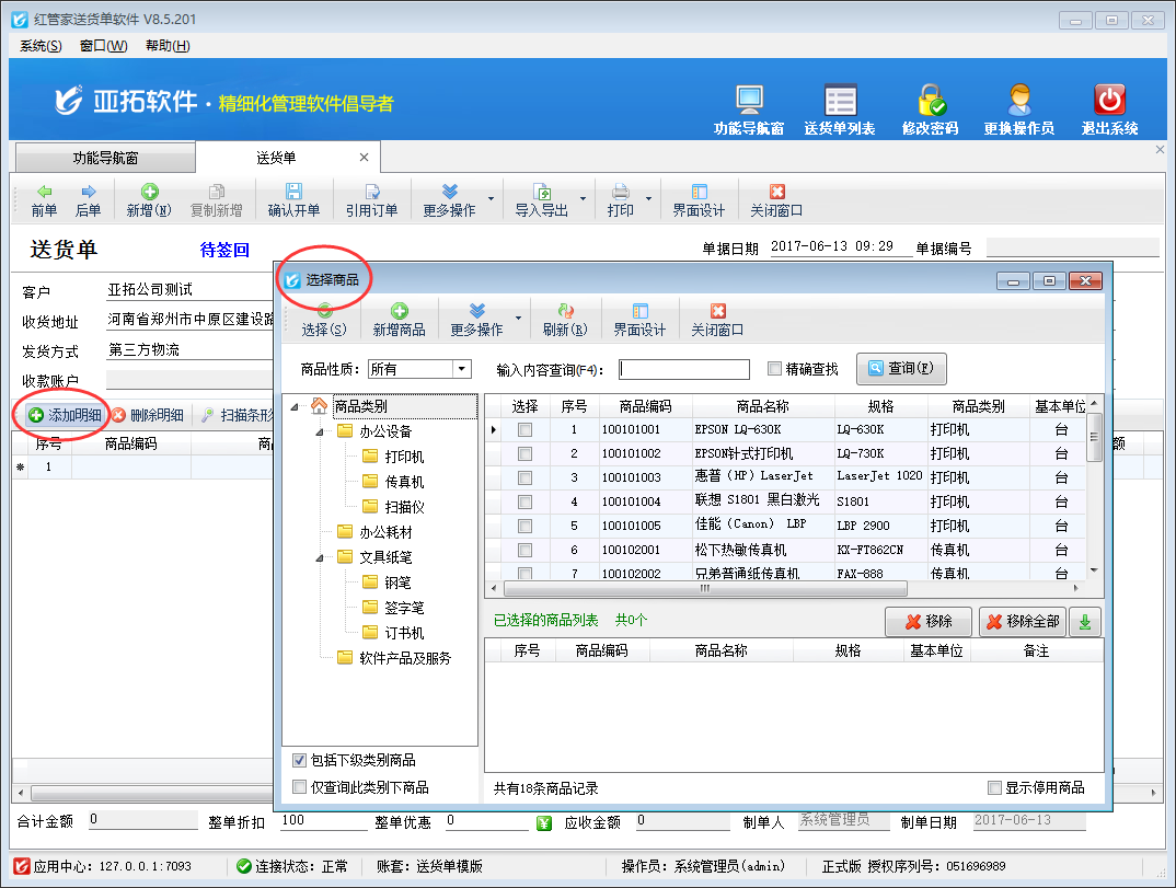 亞拓管理軟件、紅管家倉庫管理軟件、紅管家送貨單軟件等為了方便用戶可以快速開單,在單據(jù)中點擊“添加明細”按鈕默認都是彈出商品選擇窗口(如下圖一所示),可以快速選擇所需商品信息,但是部分用戶在開單時需要直接錄入新商品,而不是在商品信息庫中進行選擇,對于此種情況,軟件支持設置在單據(jù)中點擊“添加明細”按鈕時不彈出商品選擇窗口,本篇文章我們以紅管家送貨單軟件為例來詳細介紹一下如何設置在單據(jù)中點擊“添加明細”按鈕時不彈出商品選擇窗口?