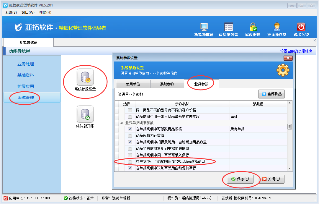 在功能導航窗點擊“系統(tǒng)管理”—》“系統(tǒng)參數(shù)配置”—》“業(yè)務參數(shù)”,即可進入到“業(yè)務參數(shù)”配置界面,在業(yè)務單據(jù)明細參數(shù)內(nèi)找到“在單據(jù)中點擊‘添加明細’時彈出商品選擇窗口”參數(shù),把這個參數(shù)的勾選去掉,然后保存,如下圖二所示。