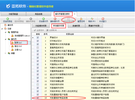 批量維護商品信息需要操作員有操作權限(系統管理員默認具有所有權限),如何設置操作員有批量修改商品信息的權限,操作步驟如下:系統管理員登錄軟件,打開“系統管理”→“操作員及授權”,選擇要添加權限的操作員,打開“其他操作權限”勾選上要選擇的權限,保存權限設置。具體如圖1所示:
