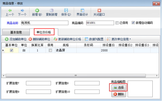 “商品信息修改”窗口點擊“單位及價格”,然后點擊“選擇”按鈕,可以選擇已準(zhǔn)備好的圖片,支持jpg、png等格式的圖片,建議圖片大小在100K以內(nèi),圖片大小過大會影響商品打開速度。選擇圖片后,點擊“保存”按鈕對商品信息保存,如圖2所示。如果需要更換商品圖片,可以點擊“刪除”按鈕刪除商品圖片,然后再從新上傳圖片即可。