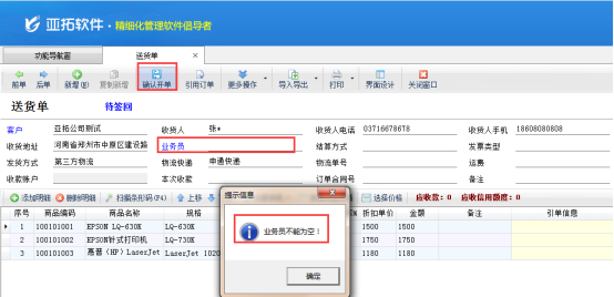 以送貨單軟件為例,示范下如果設置開單業務員允許為空。軟件安裝完成,系統參數設置默認業務員不允許為空,正常開送貨單,未在單據主體中輸入“業務員”,商品輸入完成后點擊確認開單按鈕,會提示“業務員不能為空”,如下圖1所示: