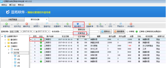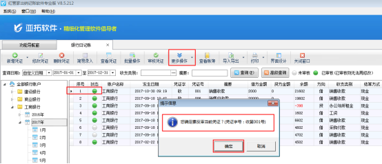 在銀行日記賬列表界面,如圖2所示,點(diǎn)擊“更多操作”——》“反審憑證”,系統(tǒng)彈出提示信息“您確定要反審當(dāng)前憑證?”,點(diǎn)擊“確定”按鈕,如圖3所示。