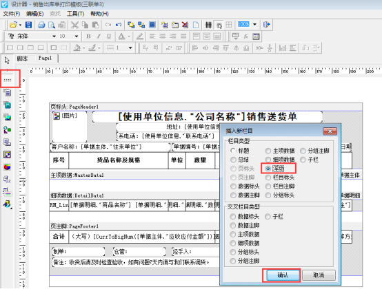 在紅管家送貨單軟件中,在功能導航窗選擇“業務處理”—》“新開送貨單”—》“打印”—》“打印格式設計”,選擇一個三聯單的打印模板,點擊“設計格式”進入模板設計器界面,在設計器界面左側的工具欄選擇“