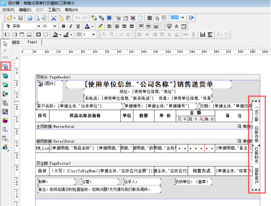 亞拓管理軟件、紅管家送貨單軟件、紅管家倉庫管理軟件都支持設置自定義打印模板,比如:三聯單打印模板,三聯單打印模板需要在右側顯示出每聯單的保存作用,以“一式三聯 白聯存根 紅聯財務 藍聯客戶”為例,示范下如何在三聯單打印模板中添加此字樣。