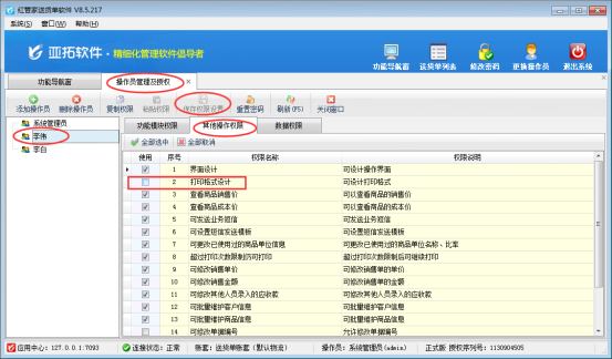 亞拓軟件自主研發(fā)的亞拓管理軟件、紅管家送貨單軟件、紅管家票據(jù)打印軟件、紅管家倉庫管理軟件都支持自定義設(shè)計打印模板,打印模板設(shè)計完成后,為了避免操作員修改錯打印模板,軟件可以設(shè)置操作員的打印模板設(shè)計權(quán)限。(系統(tǒng)管理員默認(rèn)具有所有權(quán)限,不允許修改)。