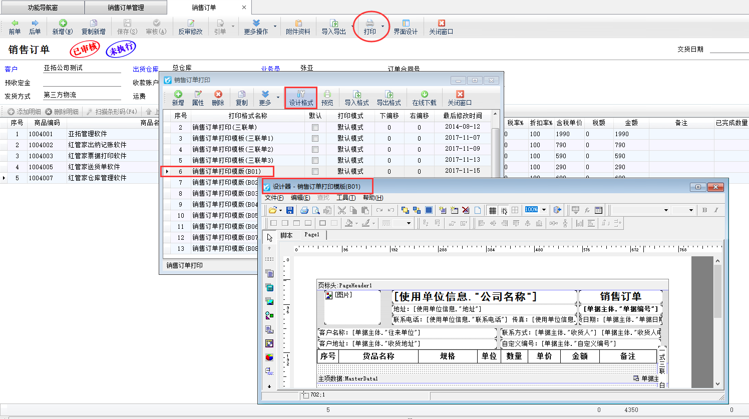 以亞拓管理軟件專業版為例,打開一個已開的銷售訂單單據,選擇“打印”按鈕下的“打印格式設計”,進入打印格式設計界面,選擇需要調整的打印格式模版,然后點擊“設計格式”按鈕進入模板設計器界面,如下圖二所示: