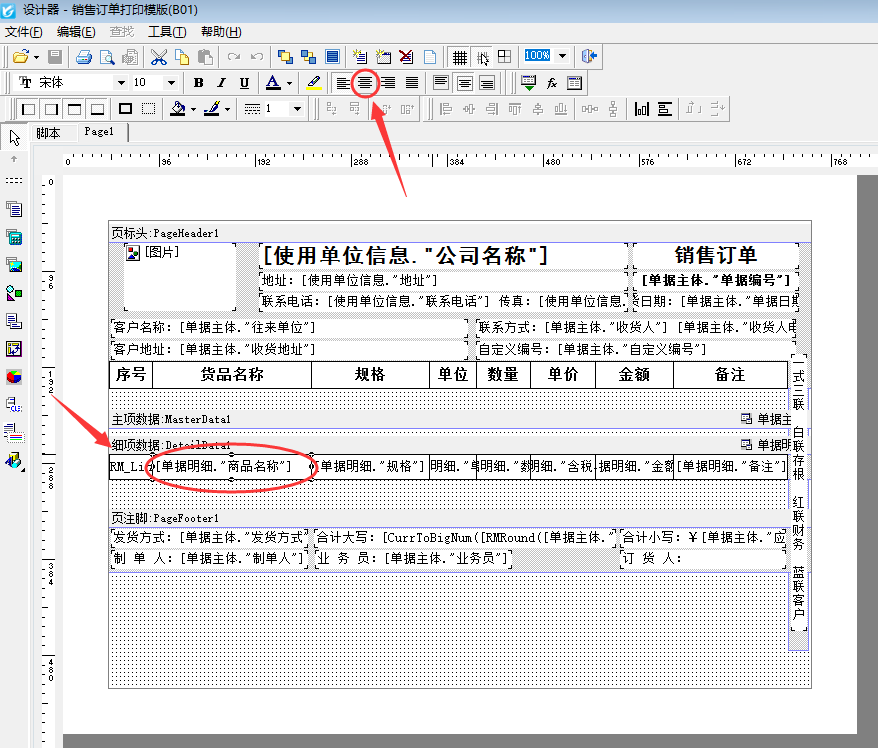 以設置“貨品名稱”內容居中顯示為例,在模版設計器界面,選擇“貨品名稱”文本框對應的細項數據欄目中的文本框,然后在工具欄中點擊“中間對齊”按鈕,設置完成后保存打印格式模版(如下圖三所示),則“貨品名稱”文本框內容即可居中顯示,如下圖四所示。