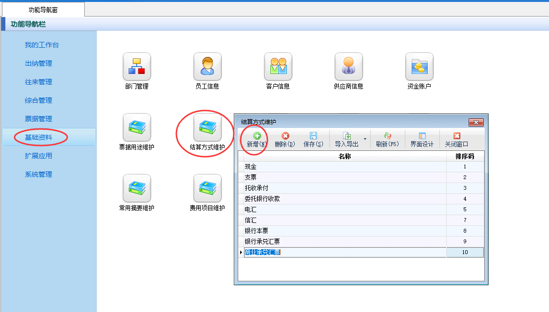 在功能導航窗點擊“基礎資料”—》“結算方式維護”即可打開“結算方式維護”界面,如圖1所示,在結算方式維護窗口可以進行新增、刪除、導入、導出結算方式信息等操作,最后點擊“保存”按鈕進行保存即可。