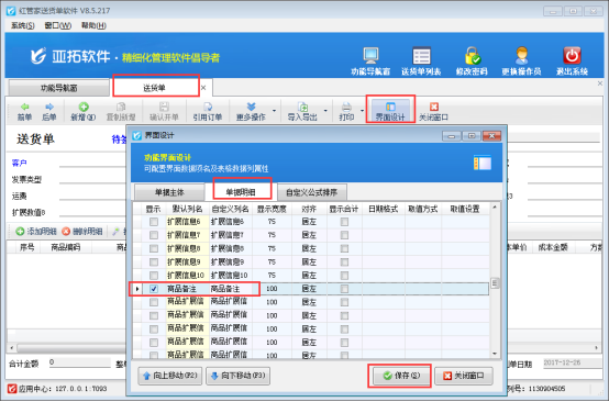 商品備注信息也支持通過Excel導(dǎo)入。商品備注信息維護好后,下邊我們示范下如何在開單界面顯示出商品備注信息,在功能導(dǎo)航窗打開“業(yè)務(wù)處理”—》“新開送貨單”在送貨單界面打開“界面設(shè)計”,在界面設(shè)計的單據(jù)明細中勾選上“商品備注”數(shù)據(jù)項,然后保存界面設(shè)計。如下圖2所示: