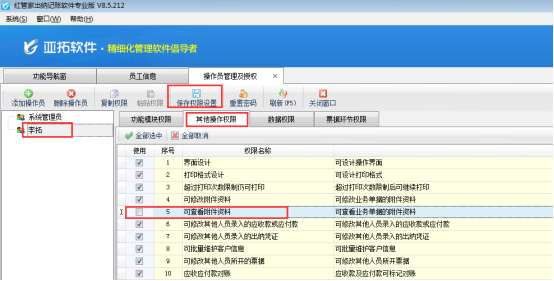 紅管家出納記賬軟件、亞拓管理軟件標準版、專業版支持日記賬導入憑證附件資料,更清晰的管理每筆日記賬的票據詳情信息。為避免每個人都查看到日記賬的詳細開票信息,軟件支持控制操作員的可查看憑證附件資料權限。