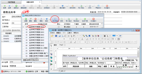 打開一個已保存的銷售出庫單單據(jù),然后在單據(jù)界面點擊“打印”—“打印格式設(shè)計”按鈕,進入“銷售出庫單打印格式設(shè)計”界面,選擇需要調(diào)整的打印格式模版(B03),然后點擊“設(shè)計格式”按鈕進入模版設(shè)計器界面,如下圖二所示。