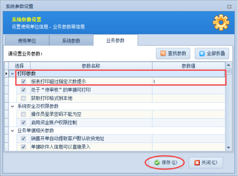 以信管飛送貨單軟件為例,示范下如何設(shè)置操作員不能超過指定的打印次數(shù)權(quán)限。首先,設(shè)置下系統(tǒng)報表打印次數(shù)提示,在功能導(dǎo)航窗點擊“系統(tǒng)管理”—》“系統(tǒng)參數(shù)配置”—》“業(yè)務(wù)參數(shù)”,在業(yè)務(wù)參數(shù)中將“報表打印超過指定次數(shù)提示”勾選上,并設(shè)置打印次數(shù),系統(tǒng)默認(rèn)打印次數(shù)為1,可根據(jù)自己實際需求設(shè)置。設(shè)置完成后點擊保存,如下圖1所示: