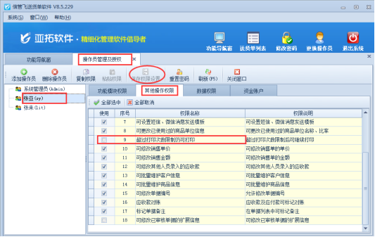 在功能導(dǎo)航窗點擊“系統(tǒng)管理”—》“操作員及授權(quán)”進(jìn)入操作員管理及授權(quán)界面,選擇操作員“張亞”(系統(tǒng)管理員默認(rèn)具有所有權(quán)限),在右側(cè)功能權(quán)限選擇“其他操作權(quán)限”,把此界面下的權(quán)限“超過打印次數(shù)限制仍可打印”取消勾選,保存權(quán)限設(shè)置,如下圖2所示: