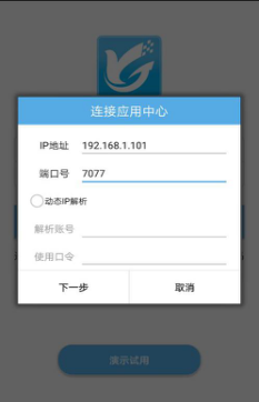 此連接需要購(gòu)買動(dòng)態(tài)IP解析服務(wù),在電腦端應(yīng)用中心啟用動(dòng)態(tài)IP解析服務(wù)后,手機(jī)APP登錄界面點(diǎn)擊選擇賬套,勾選上啟用動(dòng)態(tài)IP解析,輸入解析賬號(hào)和使用口令,點(diǎn)擊“下一步”選擇賬套登錄,如下圖4、5所示: