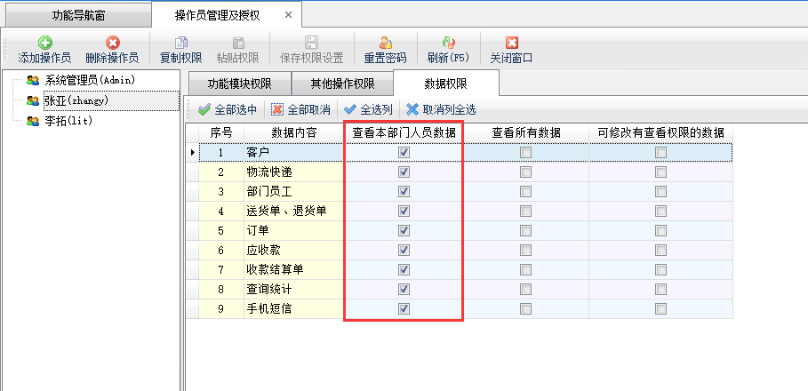信管飛送貨單軟件、亞拓管理軟件(星光版、標(biāo)準(zhǔn)版、專業(yè)版)、信管飛倉庫管理軟件,都支持設(shè)置多個操作員并對操作員進(jìn)行權(quán)限控制,通過設(shè)置操作員的“數(shù)據(jù)權(quán)限”,可以更精細(xì)的控制操作員對業(yè)務(wù)單據(jù)的查看權(quán)限。