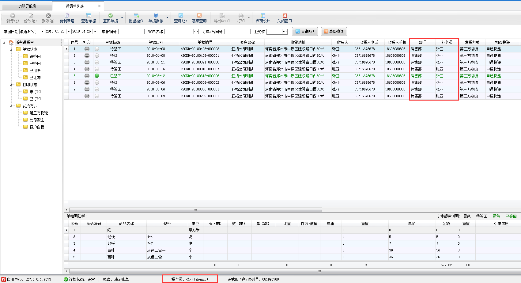 設(shè)置完成之后,我們用操作員“張亞”登錄軟件查看送貨單列表,可以看到可查看到的送貨單單據(jù)僅為本部門人員所開數(shù)據(jù),如下圖二所示。