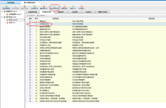 在功能導航窗點“系統管理”→“操作員及授權”即可進入“操作員管理及授權”界面,選中操作員賬號,在“其他操作權限”界面將“打印格式設計”權限打鉤取消,然后保存權限設置,如下圖一所示,設置操作員“張亞”沒有“打印格式設計”權限。