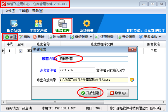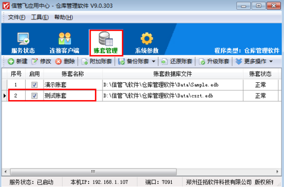 賬套即賬套數據庫,這是一個從會計業務引申出來的概念,賬套數據庫中存儲業務數據。使用軟件前建議新增加一個賬套,用于重新錄入和管理數據。本軟件的賬套是集中在主機電腦上的應用中心程序(紅色圖標)上進行的。我們公司的信管飛RMS(進銷存管理軟件)、信管飛送貨單軟件、信管飛出納記賬軟件、信管飛倉庫管理軟件等都支持新建多賬套使用,可以同時管理多個賬套。