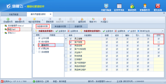 信管飛送貨單軟件、信管飛RMS、信管飛倉庫管理軟件等都支持管理基礎資料信息和允許設置多個操作員進行登錄軟件。軟件支持對基礎資料信息可以直接打印,為避免操作員打印客戶資料,本文以信管飛送貨單軟件為例,示范下如何設置操作員不可打印客戶信息。