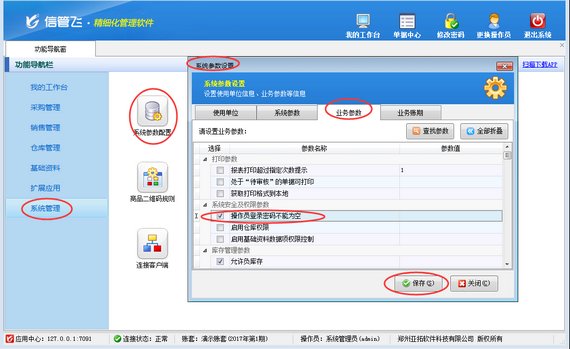 在功能導航窗點擊“系統(tǒng)管理”→“系統(tǒng)參數(shù)設置”→“業(yè)務參數(shù)”可以打開“業(yè)務參數(shù)”配置界面,在系統(tǒng)安全及權限參數(shù)內打鉤啟用“操作員登陸密碼不能為空”參數(shù),然后點擊“保存”按鈕保存設置,如下圖一所示。