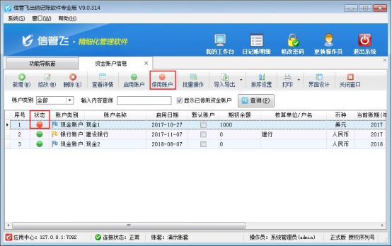 信管飛財務出納記賬軟件可以同時建立多個資金賬戶,進行管理多個資金賬戶賬目,在實際業(yè)務需求中可能會出現(xiàn)資金賬戶變動,需要停用之前賬戶及設置在出納日記賬中不顯示此賬戶,我們以“信管飛出納記賬軟件專業(yè)版”為例示范下如何停用資金賬戶及設置不顯示。