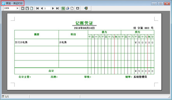 在日記賬列表界面點擊“查看賬簿”,進入銀行賬簿界面,在銀行賬簿界面,點擊打印按鈕下的打印可以直接把當前銀行賬簿信息進行打印出來,打印預覽圖如下: