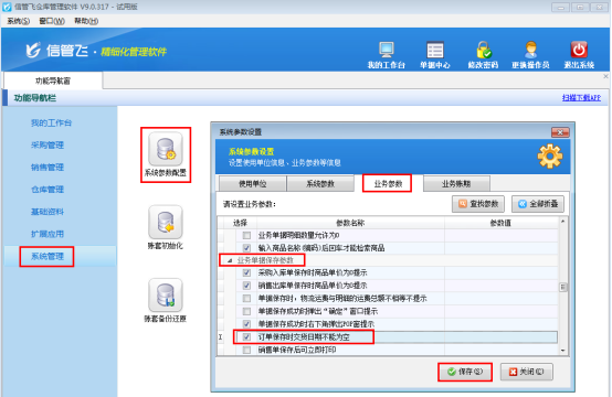 登錄軟件,在功能導(dǎo)航窗點擊“系統(tǒng)管理”—》“系統(tǒng)參數(shù)配置”—》“業(yè)務(wù)參數(shù)”可以進(jìn)入“業(yè)務(wù)參數(shù)”配置界面,在業(yè)務(wù)單據(jù)保存參數(shù)內(nèi)打勾啟用“訂單保存時交貨日期不能為空”參數(shù),如下圖1所示。