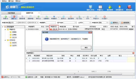 有些客戶想刪除已紅沖的單據時,發現已紅沖的單據刪除不了,如下圖所示,提示“銷售單刪除失敗!錯誤信息如下:當前單據已紅沖,不能刪除!”,那么如何刪除已紅沖的單據呢?