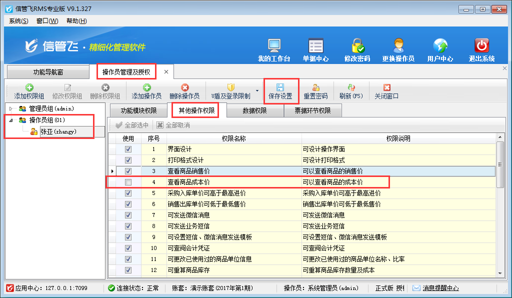 信管飛RMS、信管飛倉庫管理軟件及信管飛送貨單軟件內都可以設置多個操作員并對操作員賬號設置權限,部分用戶不希望員工賬號可以查看到商品成本價格,如何設置呢?本篇文章以信管飛RMS專業版為例詳細介紹一下進銷存管理軟件內如何設置操作員不可查看商品成本價?