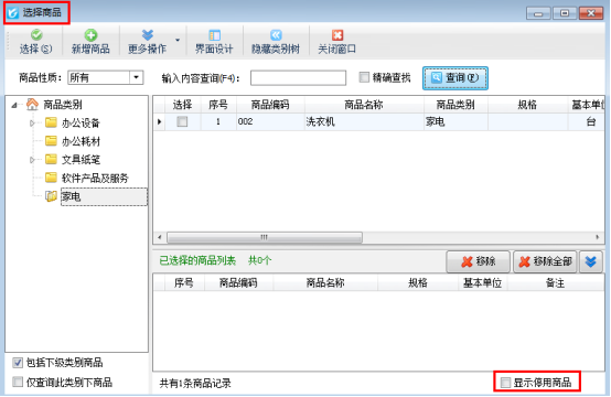 設(shè)置完成之后,新開一個(gè)單據(jù),添加商品明細(xì)進(jìn)行選擇商品時(shí),“選擇商品”窗口默認(rèn)不顯示已停用的商品,如圖2所示。