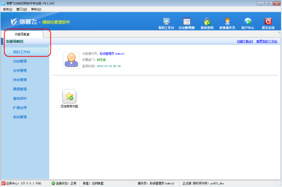亞拓軟件開發(fā)的信管飛出納記賬軟件、信管飛RMS、信管飛倉庫管理軟件、信管飛票據(jù)打印軟件等都包含我的工作臺功能,我的工作臺中可以查看當(dāng)前操作員信息,并且可以添加一些常用的功能模塊。下面我們以信管飛出納記賬軟件專業(yè)版為例詳細(xì)介紹下我的工作臺功能是如何使用的。