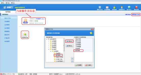 在我的工作臺界面,首先可以查看當(dāng)前操作員信息,另外點(diǎn)擊“添加常用功能”按鈕可以添加當(dāng)前操作員有權(quán)限的常用功能(點(diǎn)擊右上角“配置我的工作臺”也可以配置我的工作臺常用功能)。