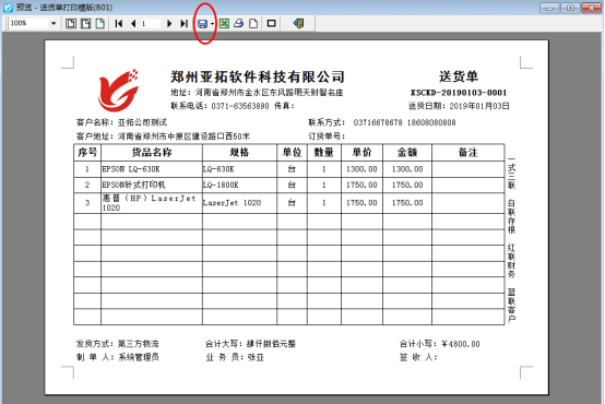 打開一個已經(jīng)開好的送貨單,點擊“打印”—》“打印預(yù)覽”,可以打開送貨單打印預(yù)覽界面,如圖1、圖2所示。