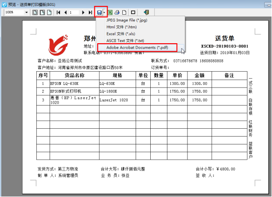信管飛送貨單軟件、信管飛RMS、信管飛倉庫管理軟件等都支持打印送貨單(銷售單),軟件支持把送貨單預(yù)覽界面導(dǎo)出到Excel文件、Html文件、Text文件及jpg、pdf等電子檔格式,方便用戶導(dǎo)出送貨單的電子檔給客戶看,方便客戶可以隨時查看送貨單內(nèi)容。下面我們以信管飛送貨單軟件為例講一下如何把送貨單預(yù)覽界面導(dǎo)出為pdf格式。
