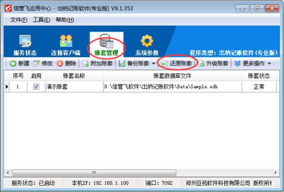 把備份數(shù)據(jù).dbk格式的文件復(fù)制到電腦桌面上,方便還原賬套進(jìn)行選擇。打開應(yīng)用中心程序(紅色圖標(biāo)),在賬套管理中點(diǎn)擊賬套文件(如沒有賬套可以新建一個(gè)新的賬套),點(diǎn)擊工具欄的“還原賬套”如下圖1所示: