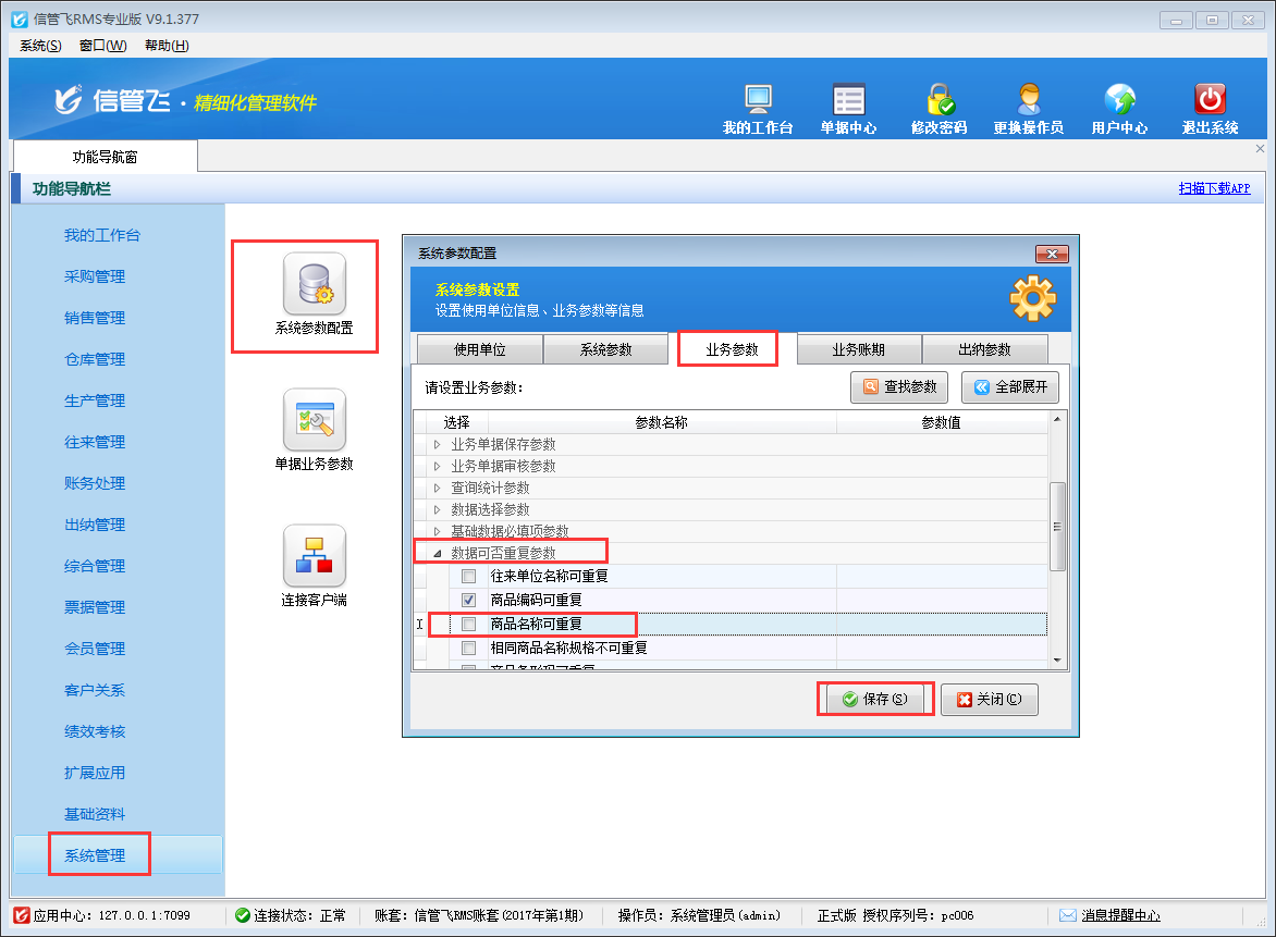 以信管飛RMS為例,在系統(tǒng)管理—》系統(tǒng)參數(shù)配置—》業(yè)務(wù)參數(shù)內(nèi)將“數(shù)據(jù)可否重復(fù)參數(shù)”中的“商品名稱可重復(fù)”參數(shù)的勾選取消,然后保存設(shè)置。如下圖所示: