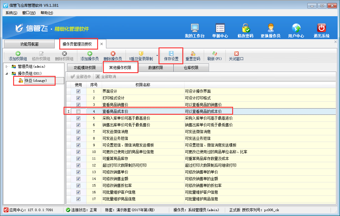 在功能導航窗點“系統管理”→“操作員及授權”即可進入“操作員管理及授權”界面,選中操作員賬號,在“其他操作權限”界面將“查看商品成本價”權限打鉤取消,如下圖一所示,設置操作員賬號“張亞”不可查看商品成本價格。