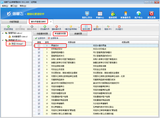 軟件內(nèi)都可以設(shè)置多個(gè)操作員并對(duì)操作員賬號(hào)設(shè)置權(quán)限,部分用戶不希望員工賬號(hào)可以隨便修改軟件界面格式,如何設(shè)置呢?本文以信管飛倉庫管理軟件為例詳細(xì)介紹一下如何設(shè)置操作員不可進(jìn)行軟件界面設(shè)計(jì)?
