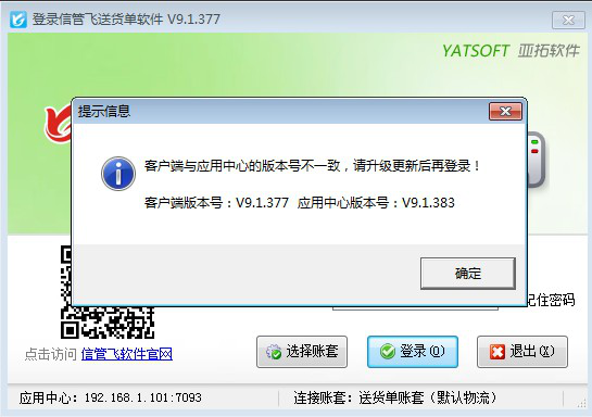 點擊“確定”指定更新程序后,點擊客戶端電腦登錄軟件,登錄時會提示“客戶端與應用中心版本號不一致,請升級更新后再登錄”,我們點擊“確定”按鈕,如下圖所示: