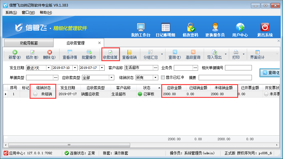 在應(yīng)收款管理界面點(diǎn)擊“收款結(jié)算”按鈕可以打開收款結(jié)算單對(duì)應(yīng)收款進(jìn)行收款結(jié)算,如下圖所示,在收款結(jié)算單單據(jù)主體選擇收款賬戶后錄入“收款金額”2000元,單據(jù)明細(xì)中“本次結(jié)銷金額”錄入2000元,保存并審核收款結(jié)算單即可。