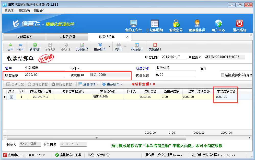 注意:收款結(jié)算單單據(jù)明細(xì)中“本次結(jié)銷金額”的合計(jì)金額,必須等于可結(jié)銷金額(收款金額 + 優(yōu)惠金額),否則無法保存收款結(jié)算單。