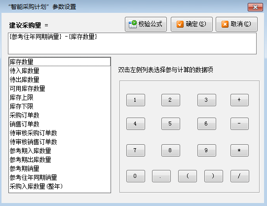 (1)參數(shù)設(shè)置:可以設(shè)置“建議采購量”的運算公式,軟件將根據(jù)您設(shè)計的公式計算出建議數(shù)量。