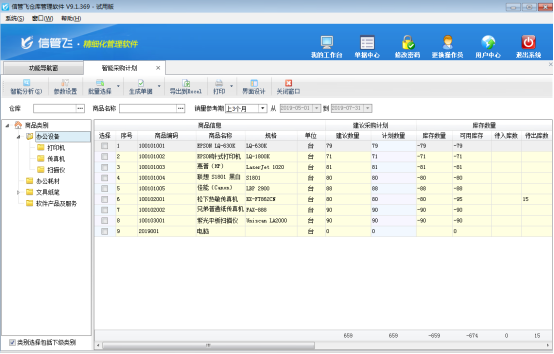 信管飛倉庫管理軟件支持由智能采購計劃生成采購計劃單。智能采購計劃可根據(jù)當(dāng)前庫存情況,并可結(jié)合庫存上下限、同期銷售量、銷售訂單數(shù)量、待審核數(shù)量等條件進行組合運算,從而給出建議的商品采購量。可以把建議結(jié)果生成為采購訂單。智能采購計劃具體操作步驟如下: