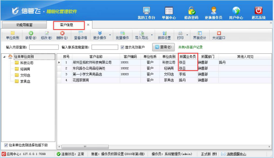 首先需要先設置下客戶資料的所屬業務員,在功能導航窗選擇“基礎資料”—》“客戶信息”在客戶信息界面,設置客戶的所屬業務員,本文以操作員“張亞”為例,如下圖所示: