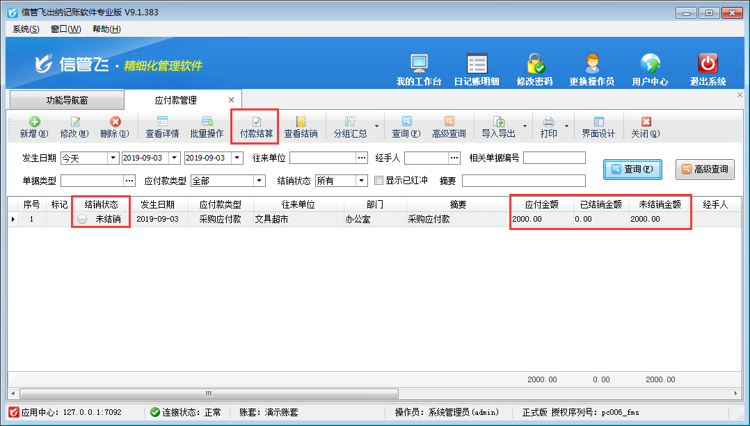 在功能導(dǎo)航窗點(diǎn)擊“往來(lái)管理”—》“應(yīng)付款管理”打開應(yīng)付款管理界面新增一條應(yīng)付款記錄,如下圖所示,供應(yīng)商“文具超市”應(yīng)付金額為2000元,已結(jié)銷金額為0。