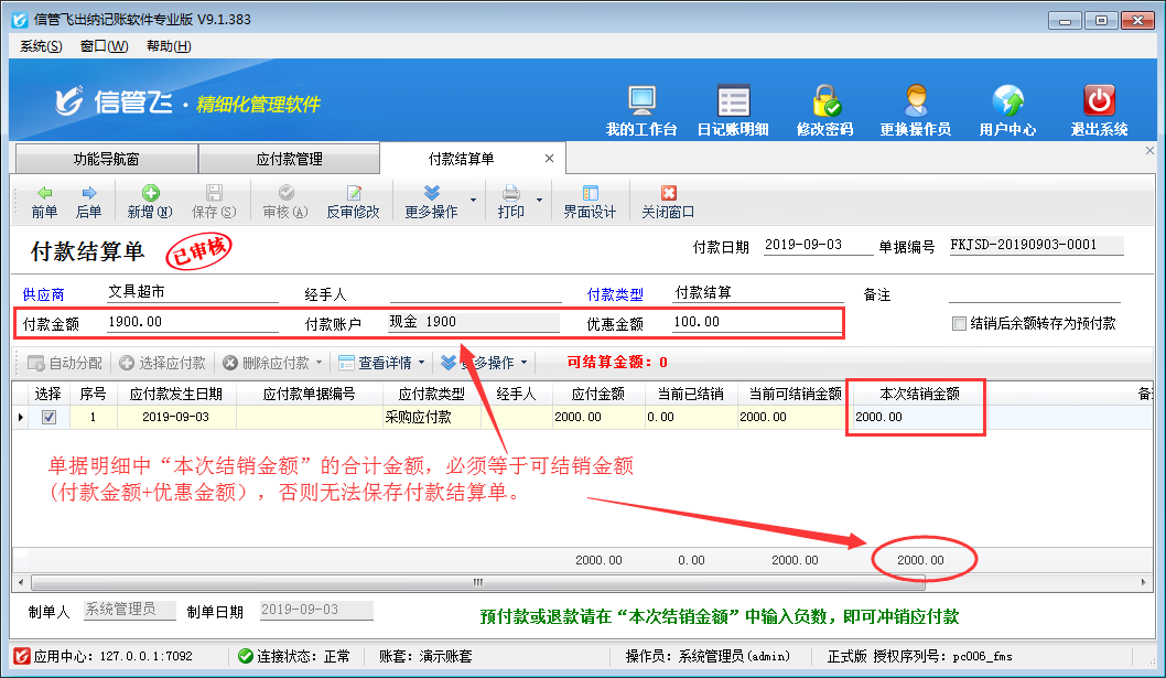 注意:付款結(jié)算單單據(jù)明細(xì)中“本次結(jié)銷金額”的合計(jì)金額,必須等于可結(jié)銷金額(付款金額 + 優(yōu)惠金額),否則無(wú)法保存付款結(jié)算單。